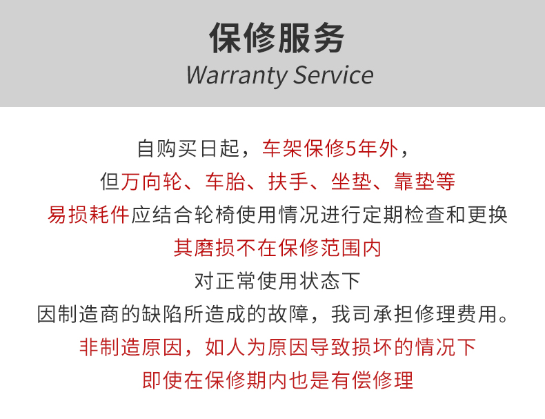 關(guān)于保修:自購買日起,除了本體車架保修5年外,其他部分保修1年。對正常使用狀態(tài)下,因制造商的缺陷所造成的故障,我司承擔修理費用。但萬向輪、車胎、扶手、坐墊、靠墊等易損耗件應(yīng)結(jié)合輪椅使用情況進行定期檢查和更換,其磨損不在保修范圍內(nèi)。(非制造原因,如人為原因?qū)е聯(lián)p壞的情況下,即使在保修期內(nèi)也是有償修理)