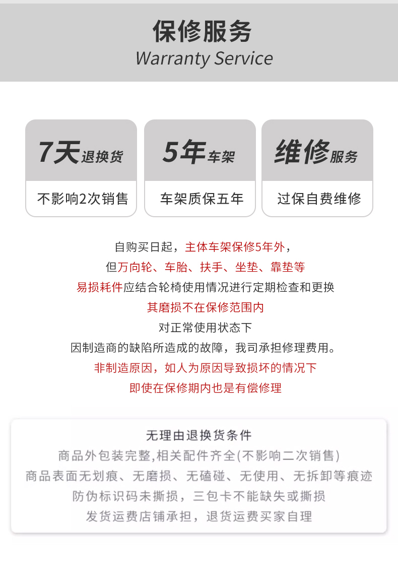 關(guān)于保修:自購買日起,除了本體車架保修5年外,其他部分保修1年。對(duì)正常使用狀態(tài)下,因制造商的缺陷所造成的故障,我司承擔(dān)修理費(fèi)用。但萬向輪、車胎、扶手、坐墊、靠墊等易損耗件應(yīng)結(jié)合輪椅使用情況進(jìn)行定期檢查和更換,其磨損不在保修范圍內(nèi)。(非制造原因,如人為原因?qū)е聯(lián)p壞的情況下,即使在保修期內(nèi)也是有償修理)