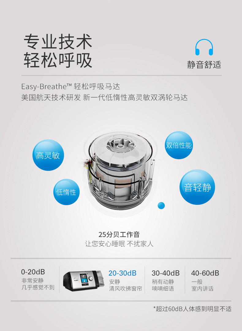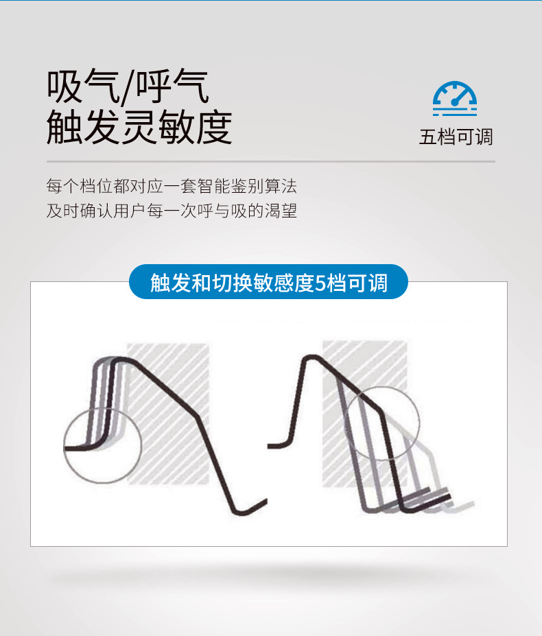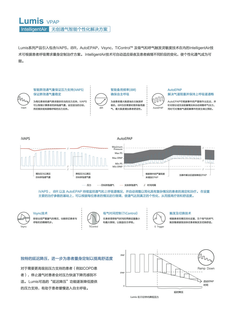 • 智能個性化解決方案 (IntelligentAir) 包括延遲升/降壓、吸/呼氣靈敏度、Ticontrol、Vsync、iVAPS、AutoEPAP、iBR 等七項核心技術,為您提供匹配個體需求的每一次通氣。