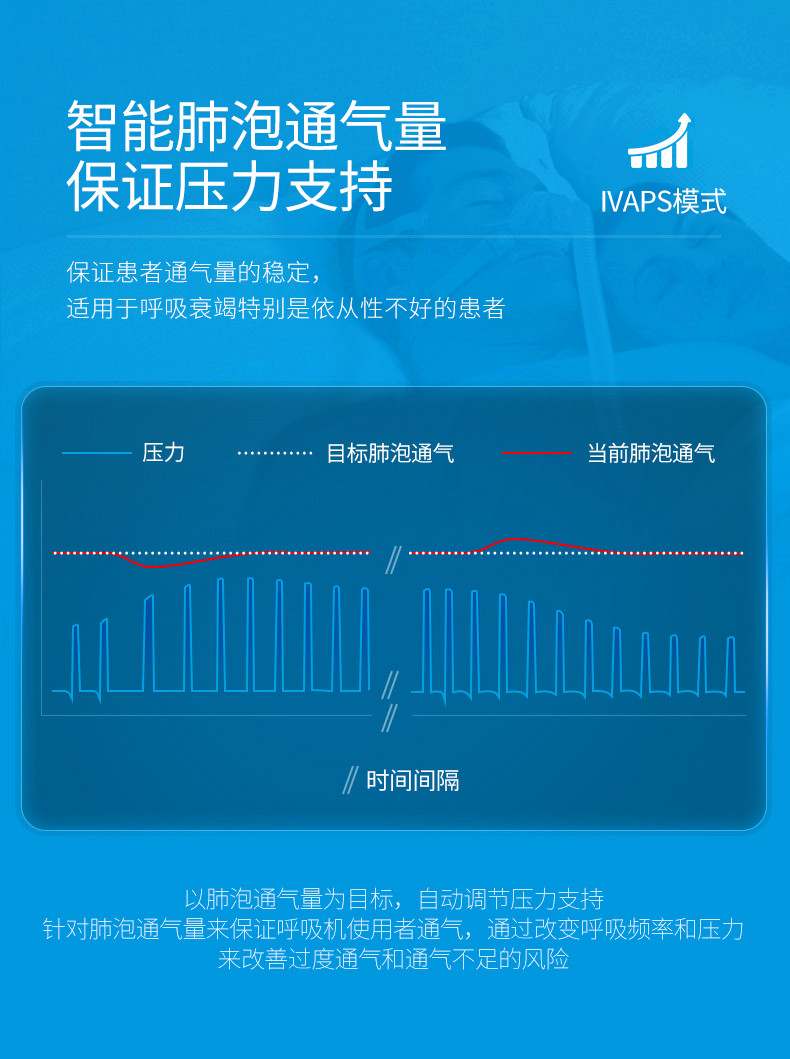 • 智能肺泡通氣量保證壓力支持模式(iVAPS):由瑞思邁公司研發(fā)的智能模式,通過自動調節(jié)壓力支持和提供智能后備頻率,保證肺泡通氣量。相較傳統(tǒng)以潮氣量為通氣目標,肺泡通氣量更精準反映患者通氣狀態(tài)。自動壓力調節(jié),減輕患者和醫(yī)護人員負荷。