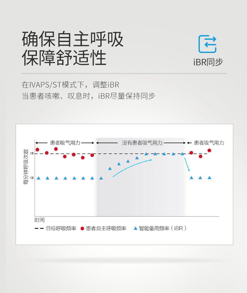 • 智能后備頻率(iBR):排除因嘆息、咳嗽等一過性呼吸頻率降低而導致的呼吸機強制通氣,保障舒適性的同時,最大限度保留了自主呼吸。