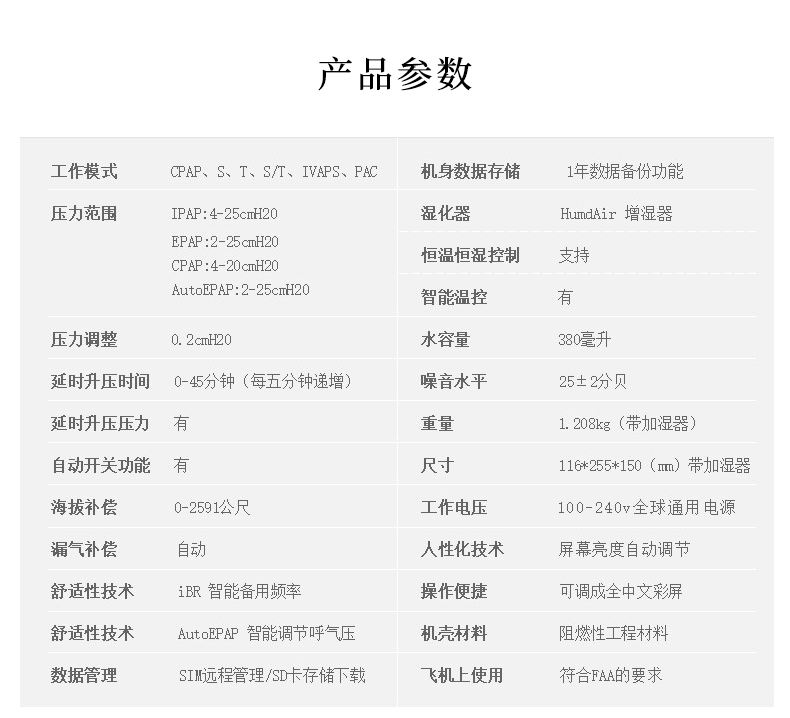 • 壓力范圍:IPAP:4-25cmH20,EPAP:2-25cmH20,CPAP:4-20cmH20,AutoEPAP:2-25cmH20