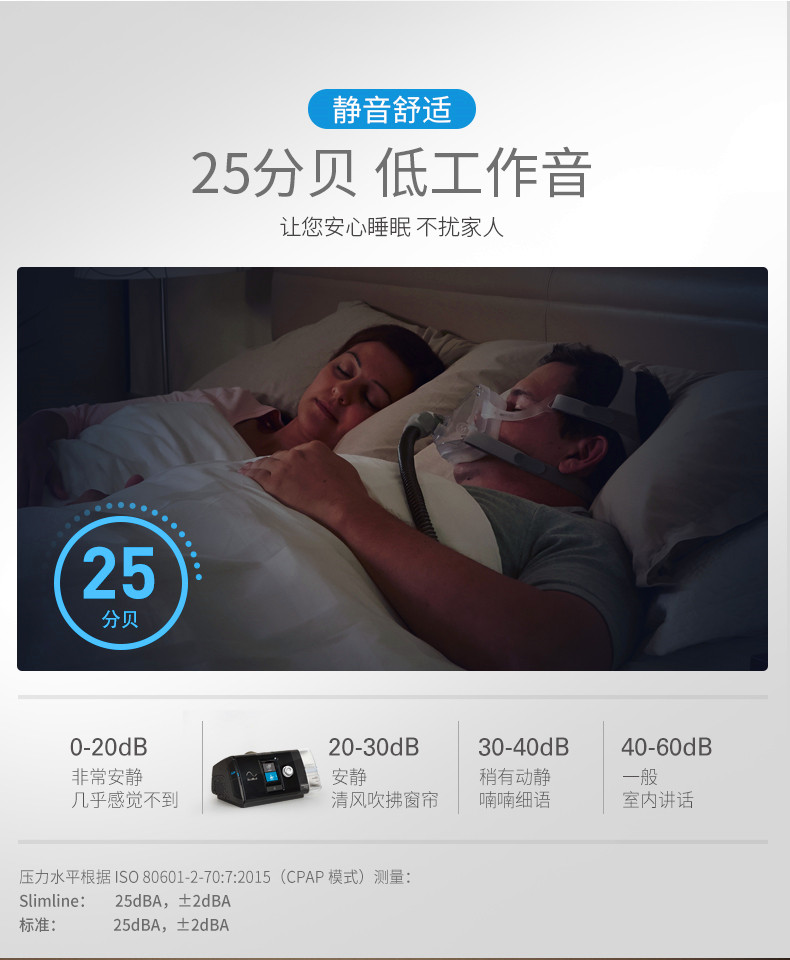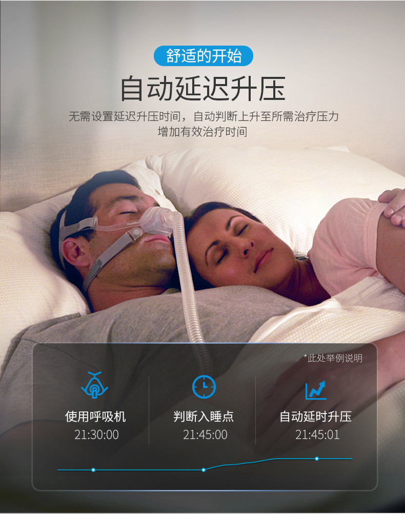 3. SmartStart?功能。 在您戴上面罩呼吸時開始您的睡眠呼吸暫停治療。當您摘下面罩后,該功能在幾秒鐘后自動停止。