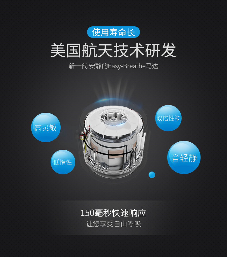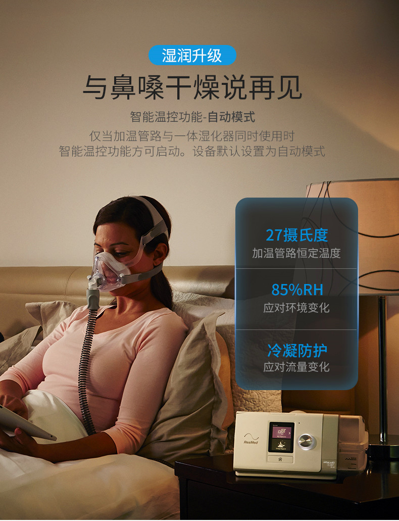 4. 結(jié)合HumidAir?加濕器加熱加濕,及Climate Control智能溫控技術(shù),保證面罩端高達85%相對濕度的溫潤氣體,從而讓您遠離鼻咽不適。