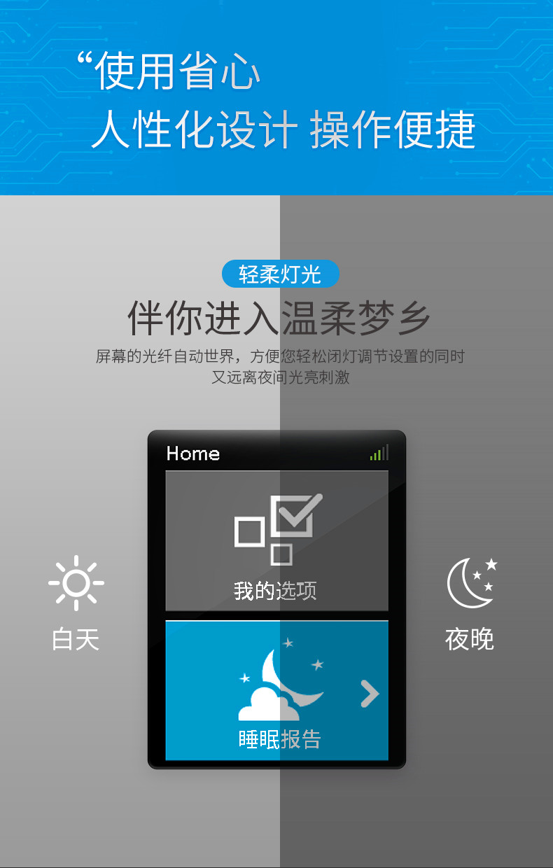 1. 內(nèi)置環(huán)境光傳感器。屏幕的光線自動識別功能,方便您您輕松閉燈調(diào)節(jié)設(shè)置的同時,又遠離夜間光亮刺激。