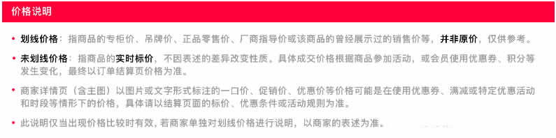 商品的實(shí)時(shí)標(biāo)價(jià),不因表述的差異改變性質(zhì)。具體成交價(jià)格根據(jù)商品參加活動(dòng),或會(huì)員使用優(yōu)惠券、積分等發(fā)生變化,最終以訂單結(jié)算頁(yè)價(jià)格為準(zhǔn)。