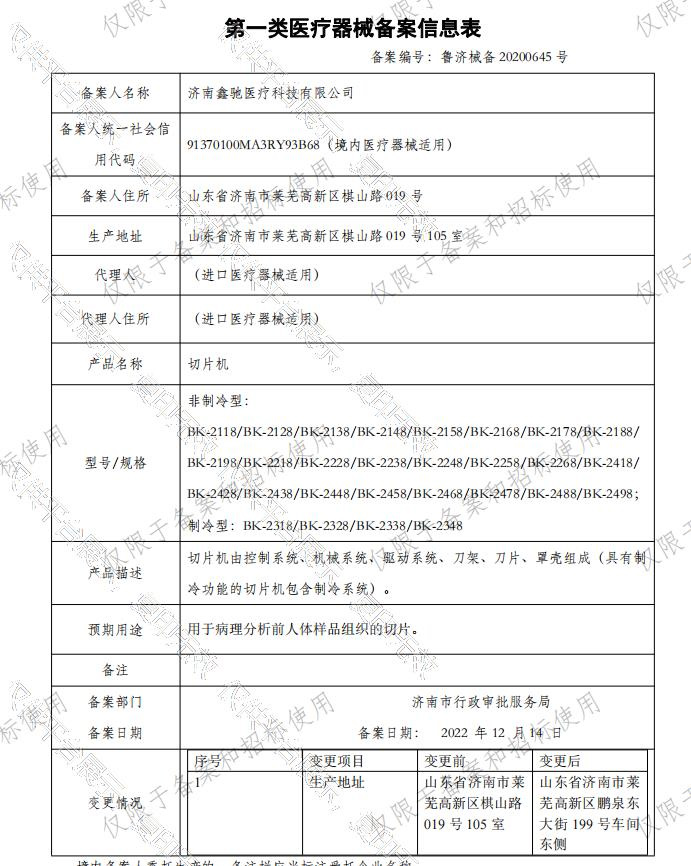 - 產(chǎn)品適用范圍:用于病理分析前人體樣品組織的切片。