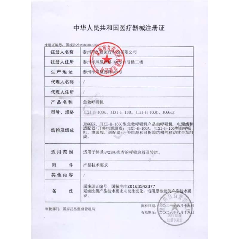- 產(chǎn)品結(jié)構(gòu)及組成:JOGGER、JIXI-H-100C型急救呼吸機(jī)產(chǎn)品由呼吸機(jī)、電源線和適配器/開(kāi)關(guān)電源組成;JIXI-H-100A、JIXI-H-100型由呼吸機(jī)、電源線、適配器/開(kāi)關(guān)電源和可拆卸結(jié)構(gòu)的移動(dòng)式臺(tái)車組成。