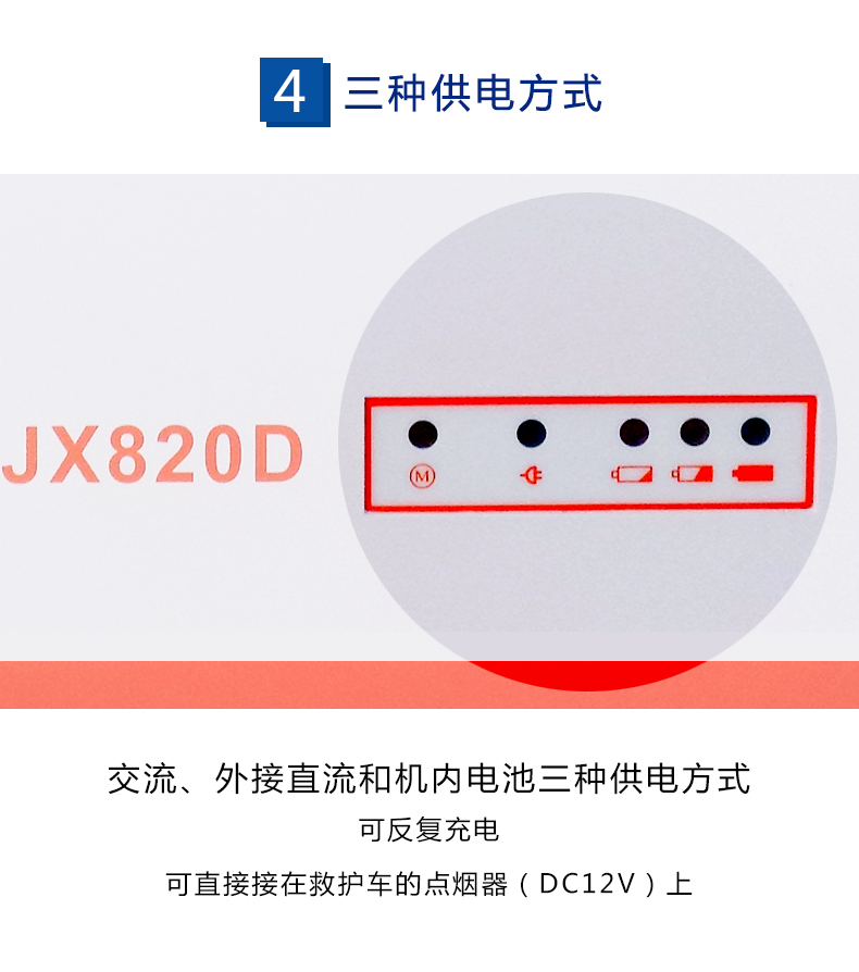• 采用交流、直流和機內電池三種供電方式,可直接接在救護車等交通工具的點煙器(DC 12V)上;