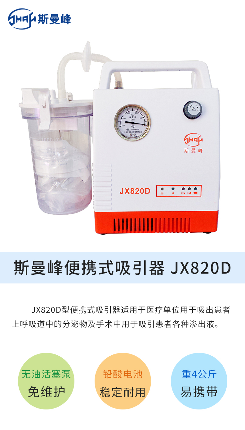 上海斯曼峰 便攜式吸引器 JX820D(鉛酸電池)產品特點: