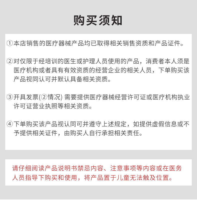 注明:購買者購買后需要提供相關(guān)資質(zhì),如果不提供相關(guān)資質(zhì)證明,自行下單者則默認(rèn)為購買者為個(gè)人用于非醫(yī)療相關(guān)使用場(chǎng)景。使用場(chǎng)景為非醫(yī)療器械場(chǎng)景不受說明書使用人群限制。