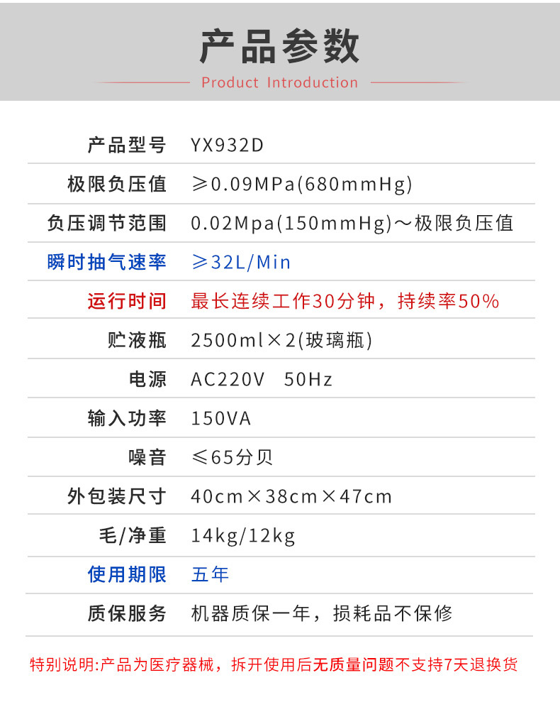 上海斯曼峰 電動(dòng)吸引器 YX932D 產(chǎn)品參數(shù):