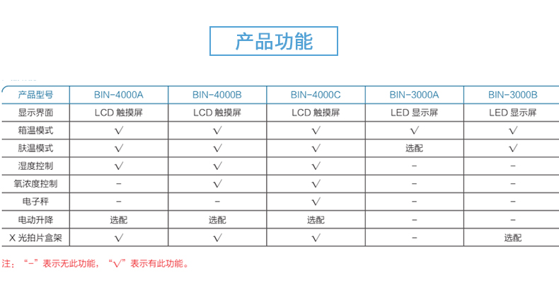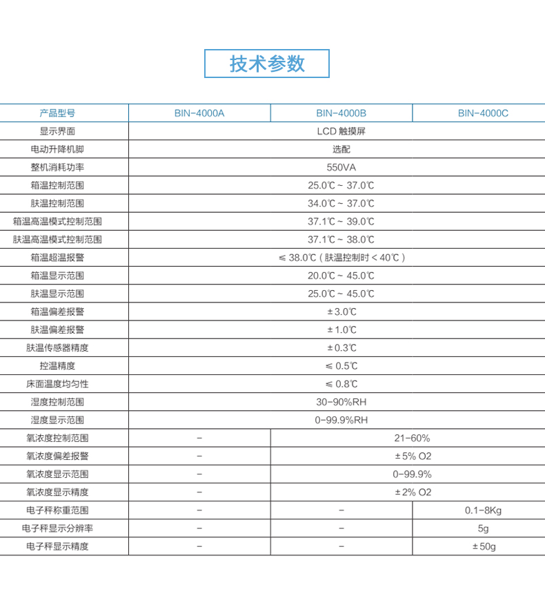 - 產(chǎn)品結(jié)構(gòu)及組成:BIN-3000A/BIN-3000B產(chǎn)品由主機(包括嬰兒艙、機箱)、膚溫傳感器、輸液架、托盤和機腳組成;BIN-4000A/BIN-4000B/BIN-4000C產(chǎn)品由主機(包括嬰兒艙、機箱)、集成傳感器盒、膚溫傳感器、照明燈、輸液架、托盤和機腳組成。
