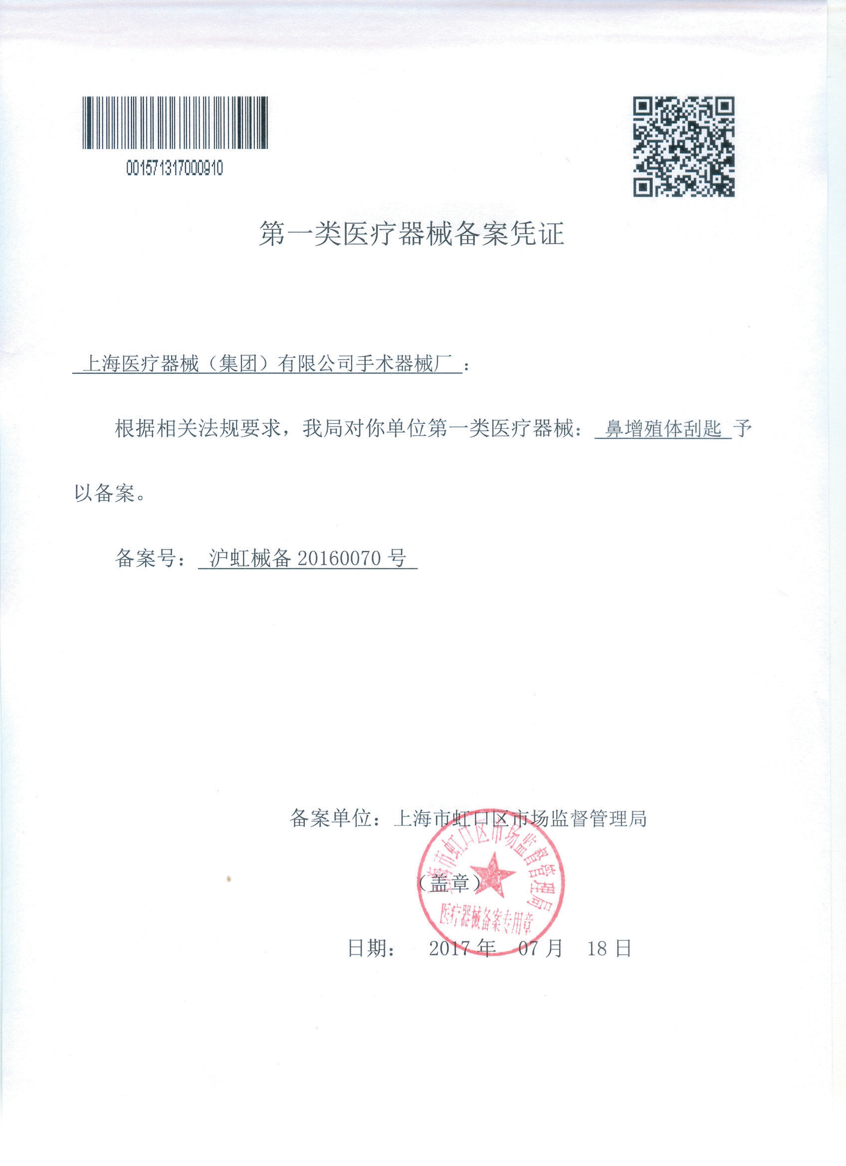 - 產品注冊證號:滬虹械備20160070號