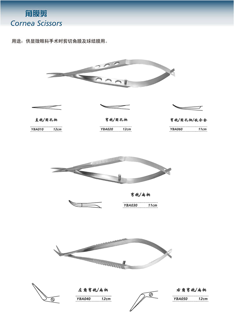 - 產品結構及組成:由一對中間連接的葉片組成,頭部有刀刃,尾部為彈簧片。角膜剪由不銹鋼或鈦合金材料制成。可重復使用。