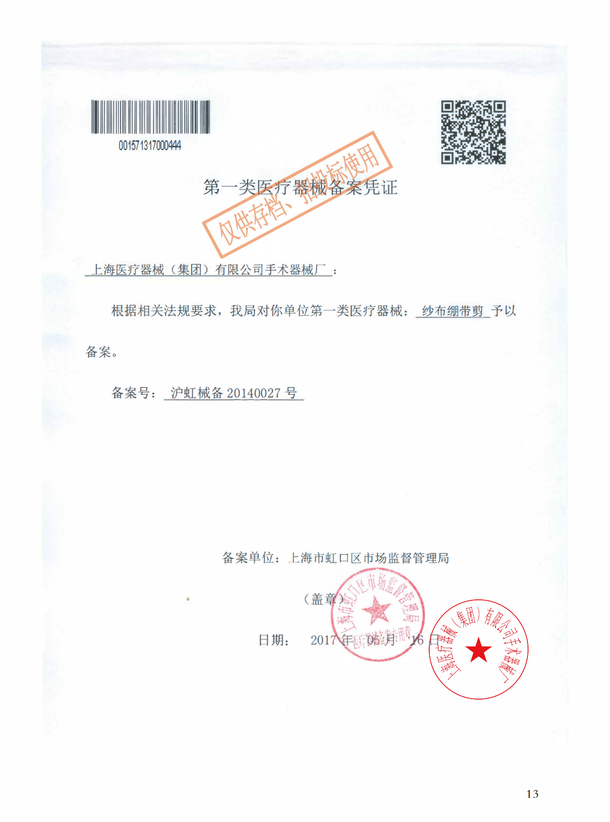 - 產(chǎn)品注冊證號:滬虹械備20140027號