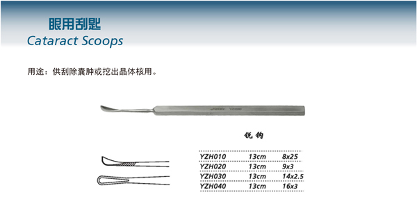 - 產品適用范圍:用于眼科手術時刮除囊腫或挖出晶體核(硬核)。
