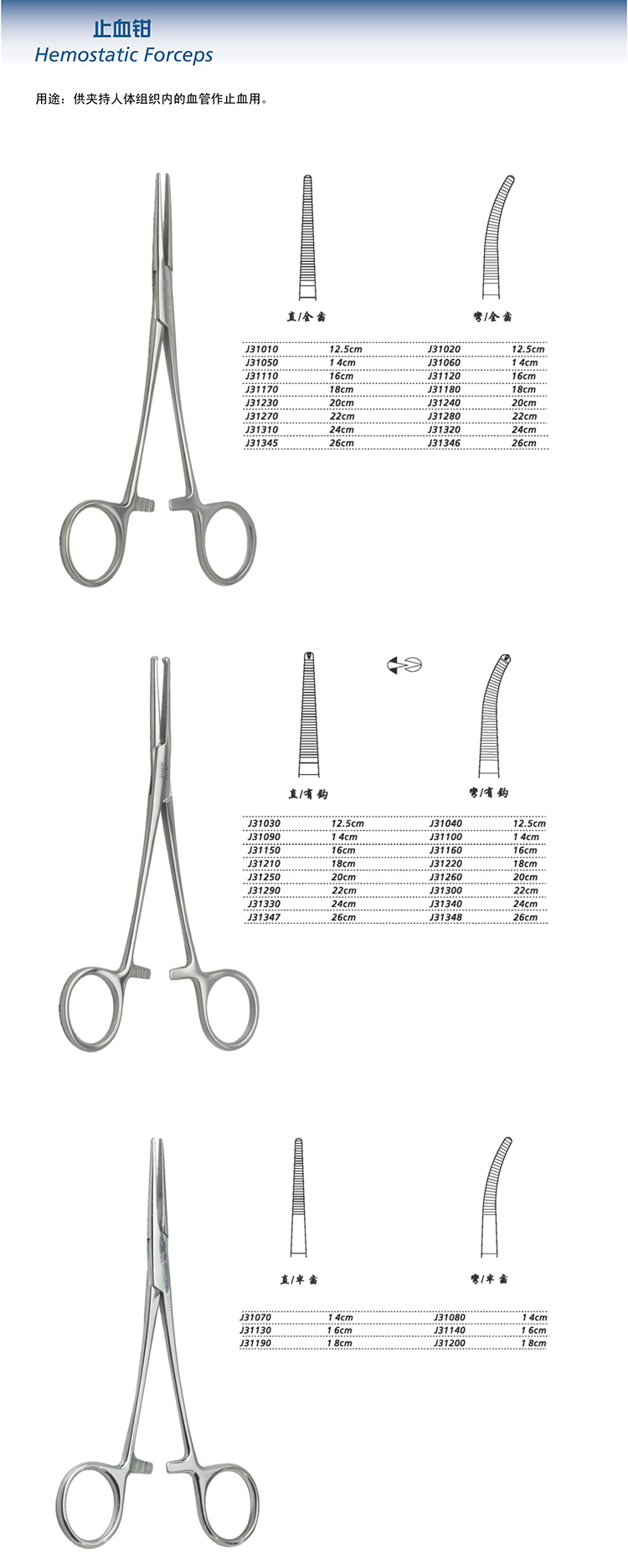 - 產(chǎn)品結(jié)構(gòu)及組成:由鉗喙、關(guān)節(jié)和鉗柄組成,頭部有唇頭齒,尾部為指圈,中間穿鰓后用鉚釘連接固定,兩指圈間有鎖止牙,起夾持固定作用。止血鉗由不銹鋼材料制成??芍貜?fù)使用。
