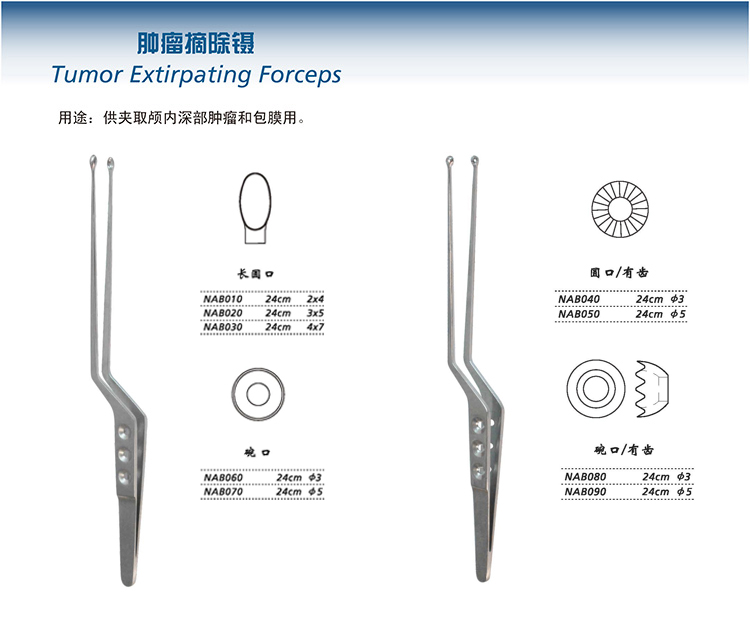 - 產品適用范圍:供夾取顱內深部腫瘤和包膜用。