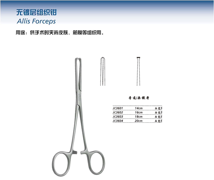- 產(chǎn)品適用范圍:組織鉗用于手術(shù)中夾持皮膚、筋膜等人體組織用