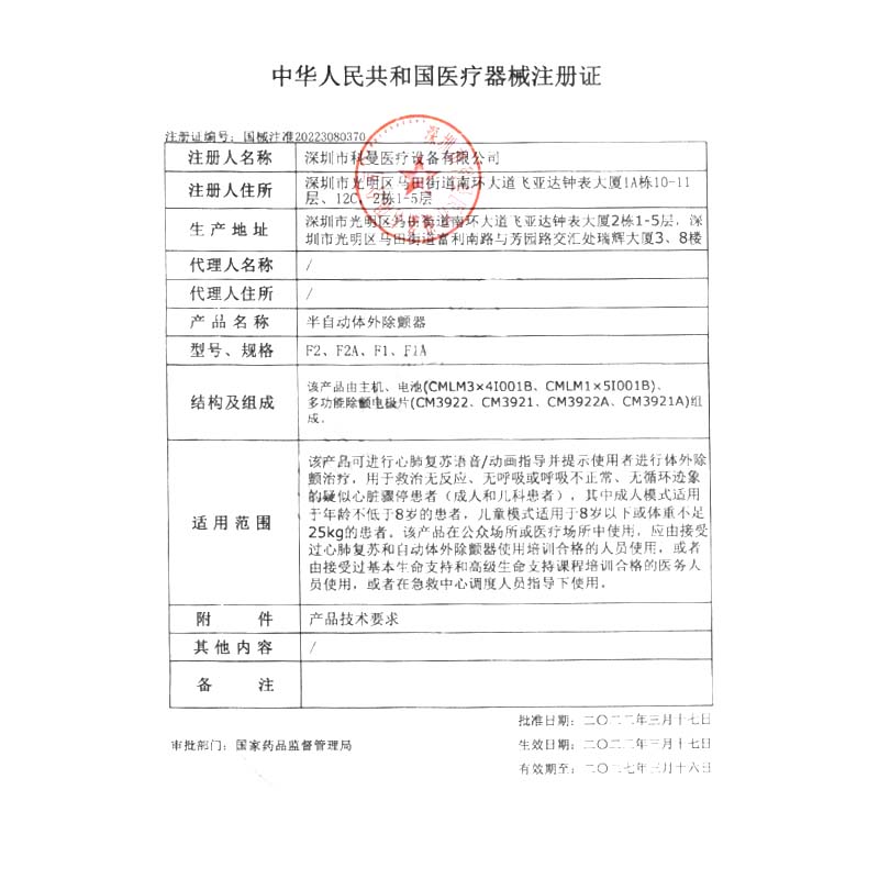 • 產(chǎn)品適用范圍:該產(chǎn)品可進行心肺復(fù)蘇語音/動畫指導(dǎo)并提示使用者進行體外除顫治療,用于救治無反應(yīng)、無呼吸或呼吸不正常、無循環(huán)跡象的疑似心臟驟停患者(成人和兒科患者),其中成人模式適用于年齡不低于8歲的患者,兒童模式適用于8歲以下或體重不足25kg的患者。該產(chǎn)品在公眾場所或醫(yī)療場所中使用,應(yīng)由接受過心肺復(fù)蘇和自動體外除顫器使用培訓(xùn)合格的人員使用,或者由接受過基本生命支持和高級生命支持課程培訓(xùn)合格的醫(yī)務(wù)人員使用,或者在急救中心調(diào)度人員指導(dǎo)下使用。