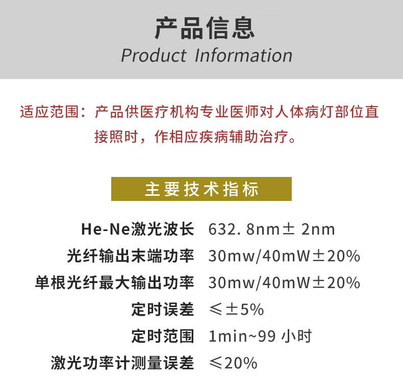 - 產(chǎn)品適用范圍:產(chǎn)品供醫(yī)療機(jī)構(gòu)專業(yè)醫(yī)師對人體病灶部位直接照射,作相應(yīng)疾病輔助治療。