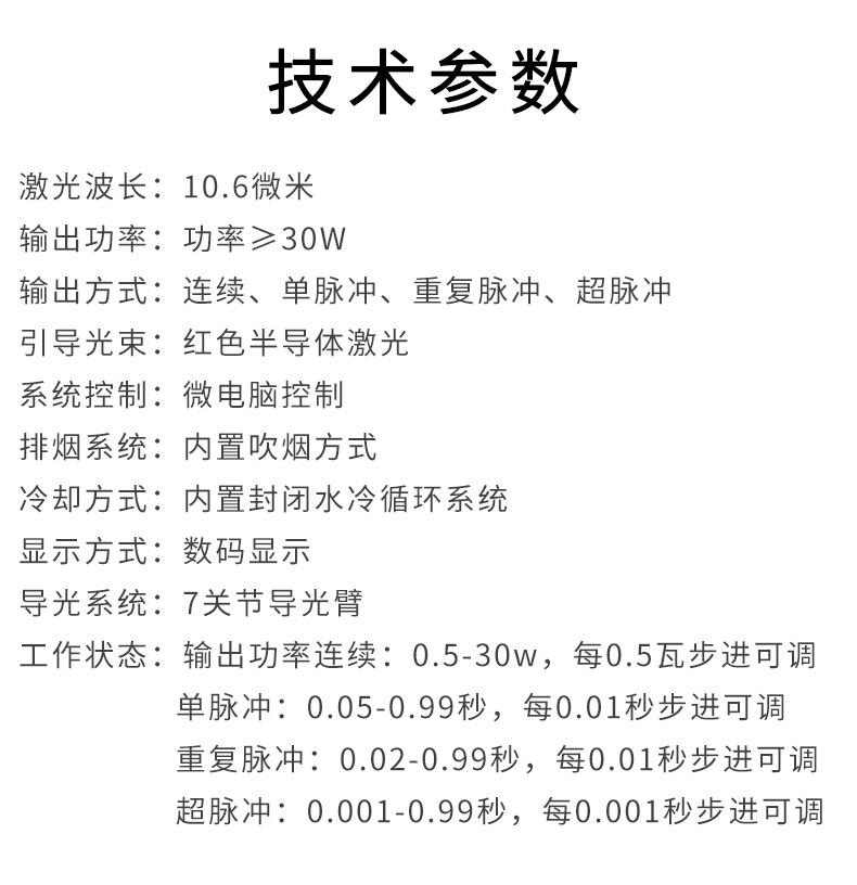 - 工作狀態(tài):輸出功率連續(xù):0.5-30w,每0.5瓦步進(jìn)可調(diào);單脈沖:0.05-0.99秒,每0.01秒步進(jìn)可調(diào);重復(fù)脈沖:0.02-0.99秒,每0.01秒步進(jìn)可調(diào);超脈沖:0.001-0.99秒,每0.001秒步進(jìn)可調(diào)