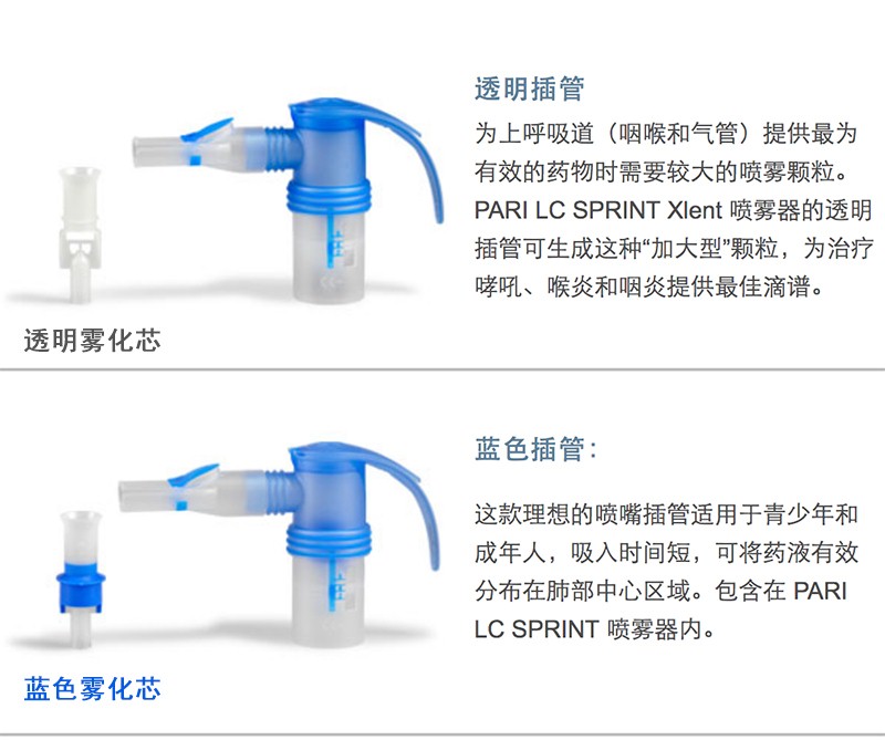 PARI LC SPRINT 噴霧器配有各種噴嘴插管,可生成不同的顆粒并根據(jù)患者的個人需求提供解決方案。