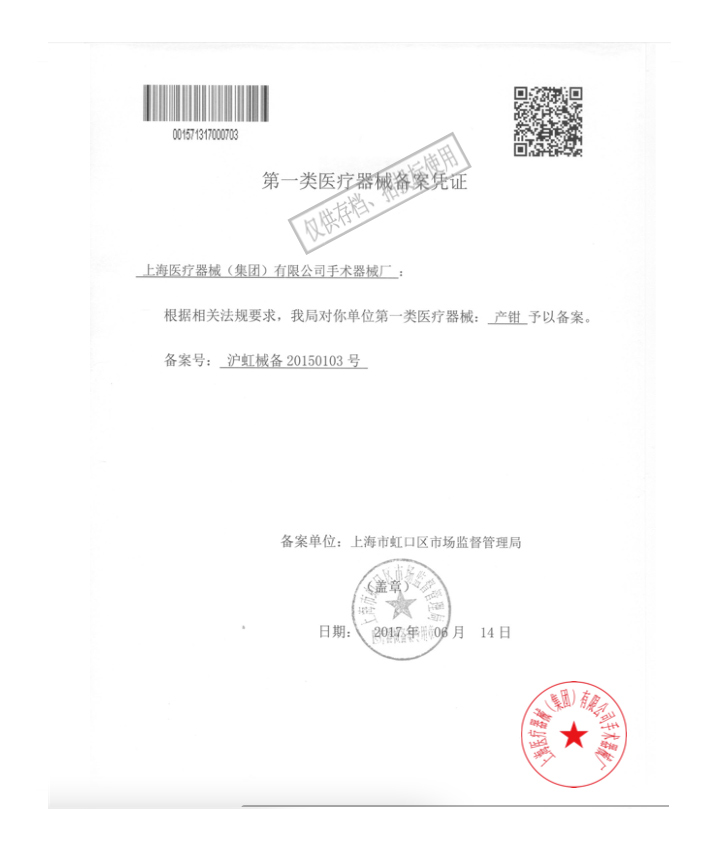 - 生產(chǎn)企業(yè):上海醫(yī)療器械(集團)有限公司手術(shù)器械廠(金鐘)