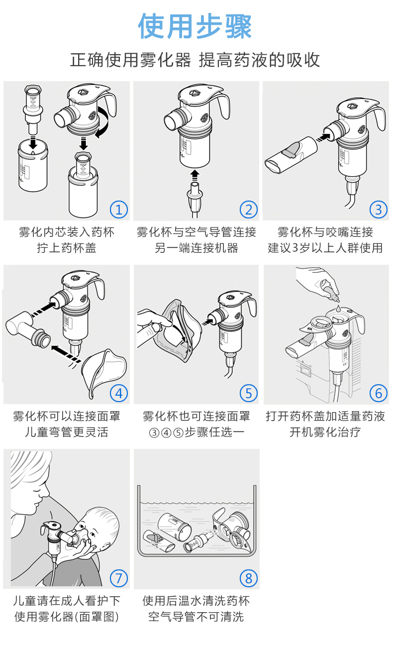 建議使用結(jié)束后,將空氣管連接霧化杯的一端分開然后繼續(xù)開機3-4分鐘吹干即可