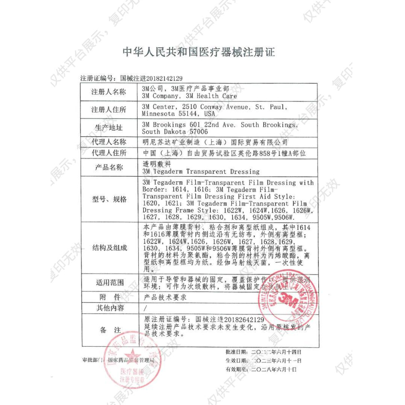 - 產品結構及組成:本產品由薄膜背襯、粘合劑和離型紙組成,其中1614和1616薄膜背襯內側邊沿有無紡布,外側有離型框;1622W, 1624W,1626, 1626W, 1627, 1628,1629, 1630, 1634, 9505W和9506W薄膜背襯外側有離型框。背襯的材料為聚氨酯,粘合劑的材料為丙烯酸酯,離型紙和離型框均為紙。經伽馬射線滅菌,一次性使用。
