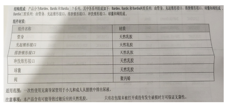 • 產(chǎn)品結(jié)構(gòu)及組成:該產(chǎn)品分為Bardex,Bardic和Bardia三個(gè)系列。其中各系列組成如下:Bardex,Bardic和Bardia兩腔系列:由管身、充起錐形接口、排泄錐形接口、球囊和閥組成。Bardia三腔系列:由管身、充起錐形接口、排泄錐形接口、沖洗錐形接口、球囊和閥組成。具有硅膠涂層,管身充起錐形接口、排泄錐形接口、沖洗錐形接口、球囊材質(zhì)為天然乳膠,閥材質(zhì)為聚丙烯。γ射線滅菌,一次性使用。