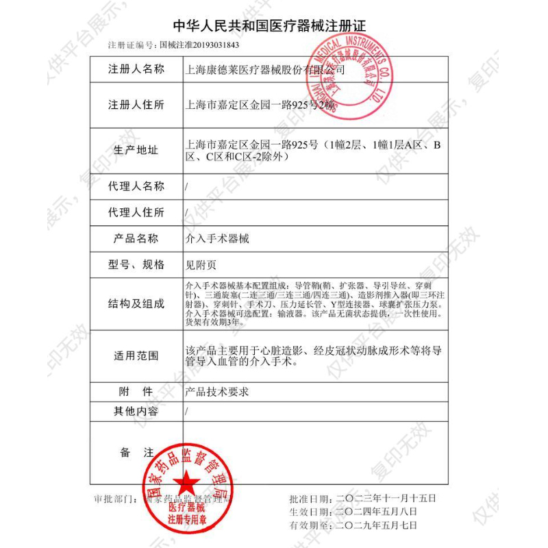 • 產(chǎn)品適用范圍:該產(chǎn)品主要用于心臟造影、經(jīng)皮冠狀動(dòng)脈成形術(shù)等將導(dǎo)管導(dǎo)入血管的介入手術(shù)。