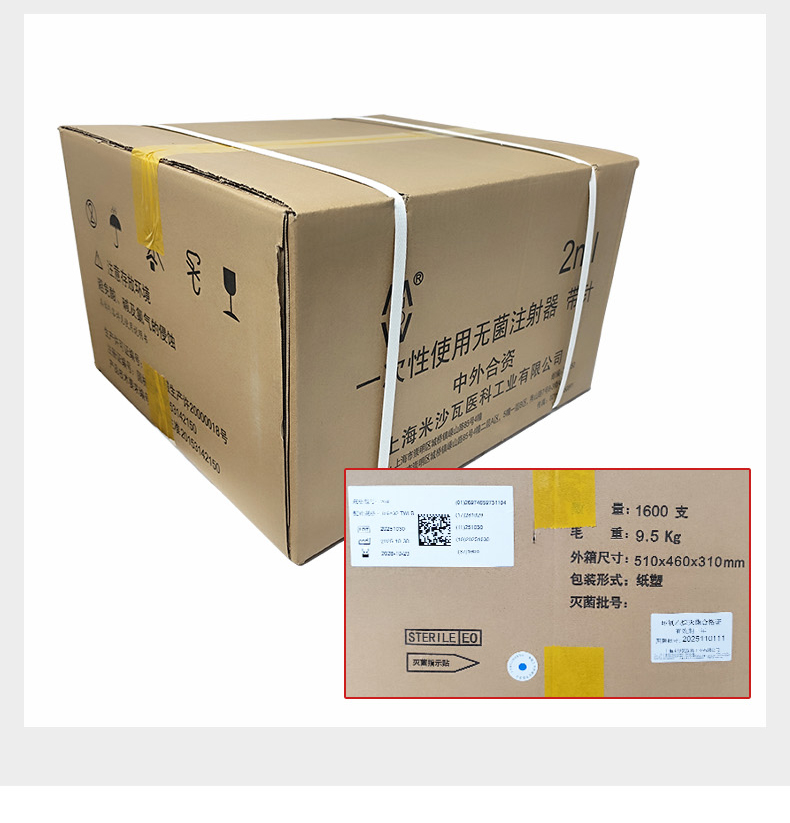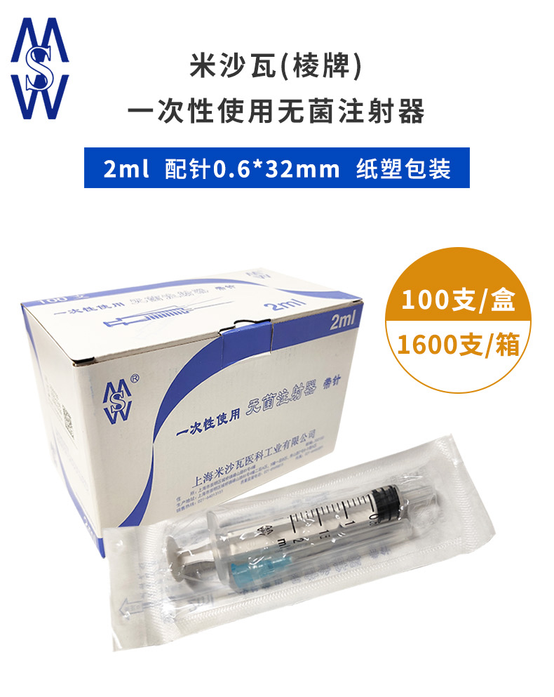 棱牌(米沙瓦)一次性使用無菌注射器 2ml 0.6*32mm 帶針 紙塑包裝 100支/盒, 1600支/箱,一箱起批貨號:60013754