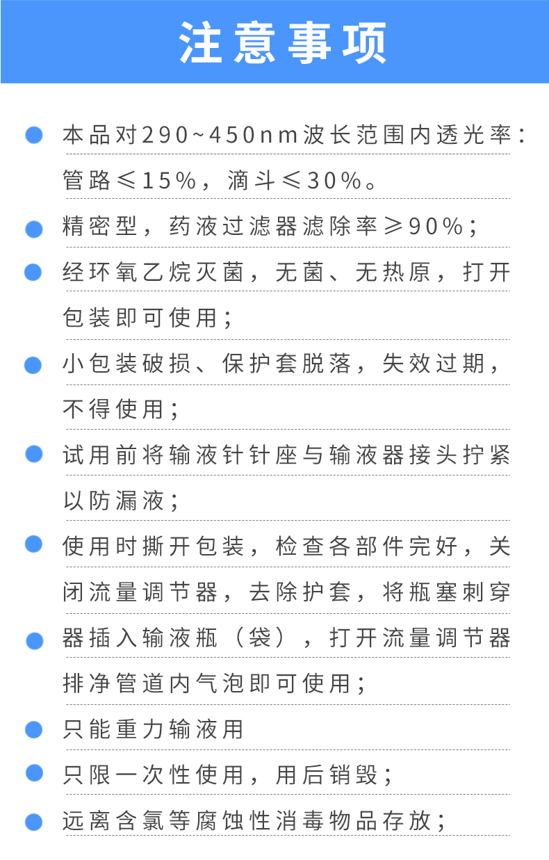 • 產(chǎn)品適用范圍:本產(chǎn)品避光范圍為290nm-450nm,適用于左氧氟沙星、硫辛酸、環(huán)磷酰胺、奧沙利鉑、尼莫司汀、順鉑、多西他賽、雷尼替丁、泮托拉唑、維生素C、紫杉醇的靜脈輸注,僅用于重力式輸液。