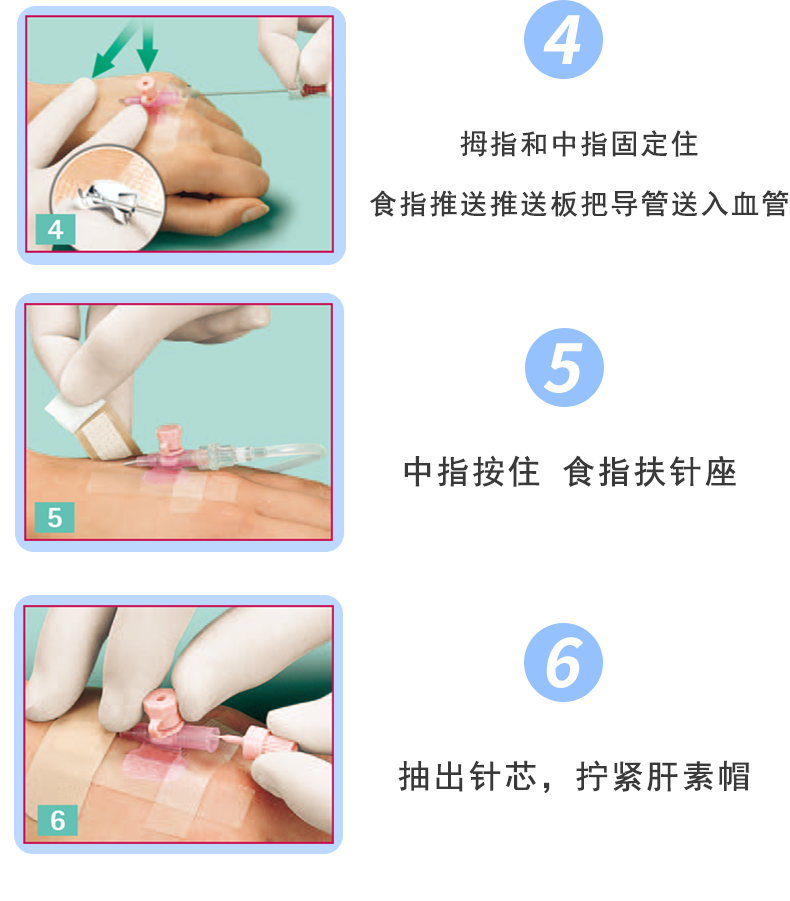 • 拇指和中指固定住。食指推送推送板把導(dǎo)管送入血管