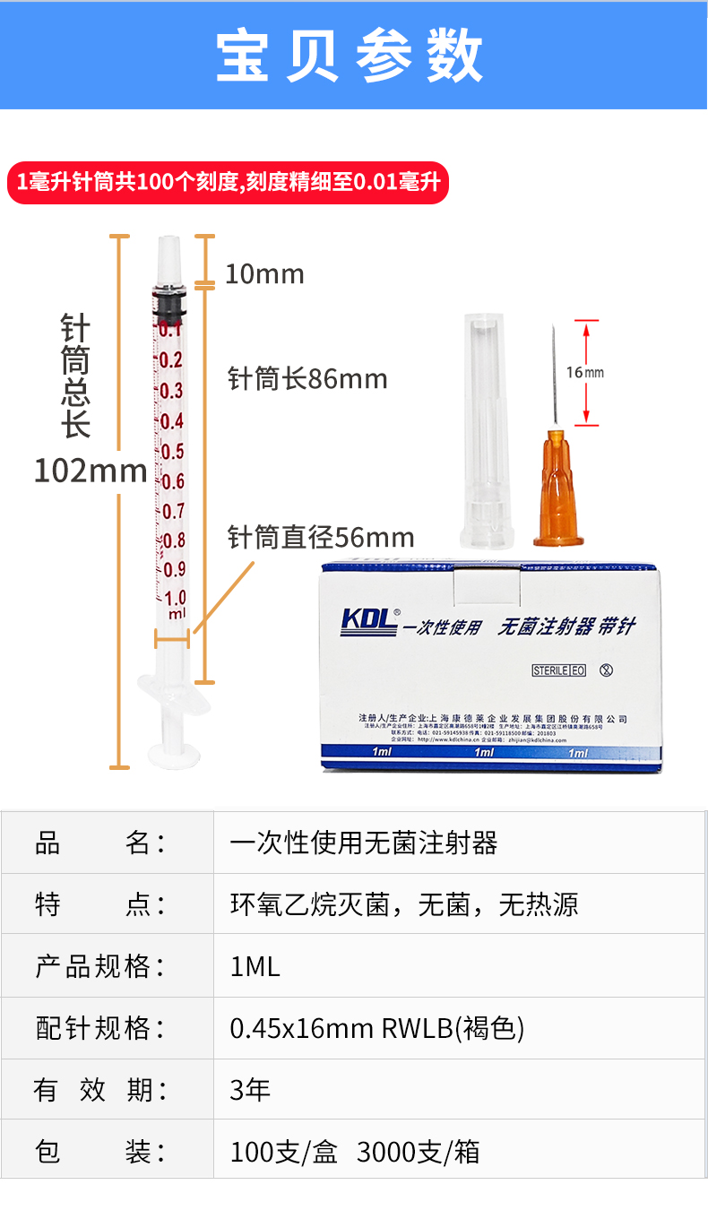 康德萊一次性使用無菌注射器平口 1ml 帶針 0.45×16mm 100支/盒,3000支/箱,一箱起批貨號(hào):60017031