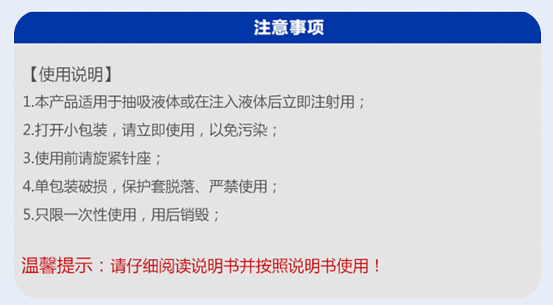 • 產(chǎn)品適用范圍:本產(chǎn)品適用于抽吸液體或在注入液體后立即注射用。