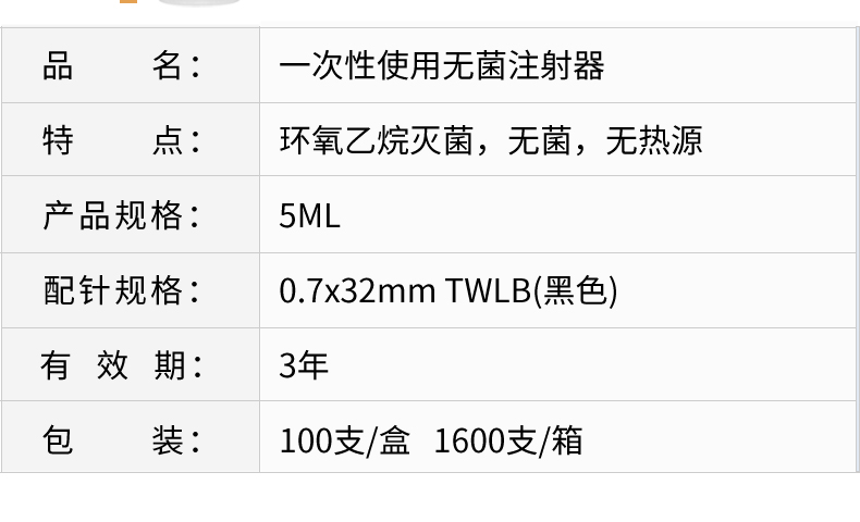 • 品名:一次性使用無菌注射器 帶針