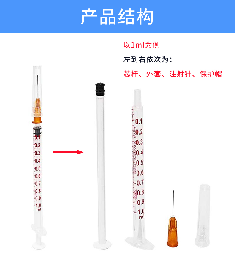 • 產(chǎn)品結(jié)構(gòu)及組成:本產(chǎn)品由外套、芯桿、活塞、注射針組成,其中注射針為可選配件。注射針由針座、針管和保護(hù)套構(gòu)成。外套、芯桿為聚丙烯材料,活塞為橡膠材料。注射針的針座、保護(hù)套為聚丙烯材料,針管為不銹鋼(SUS304)材料。