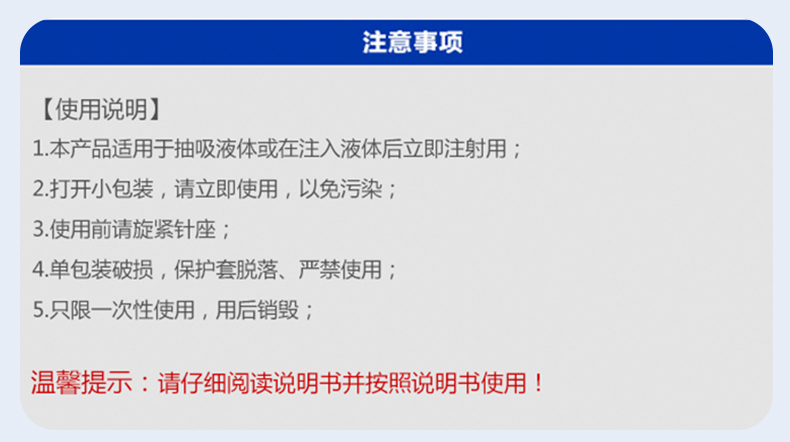 • 產(chǎn)品適用范圍:本產(chǎn)品適用于抽吸液體或在注入液體后立即注射用。