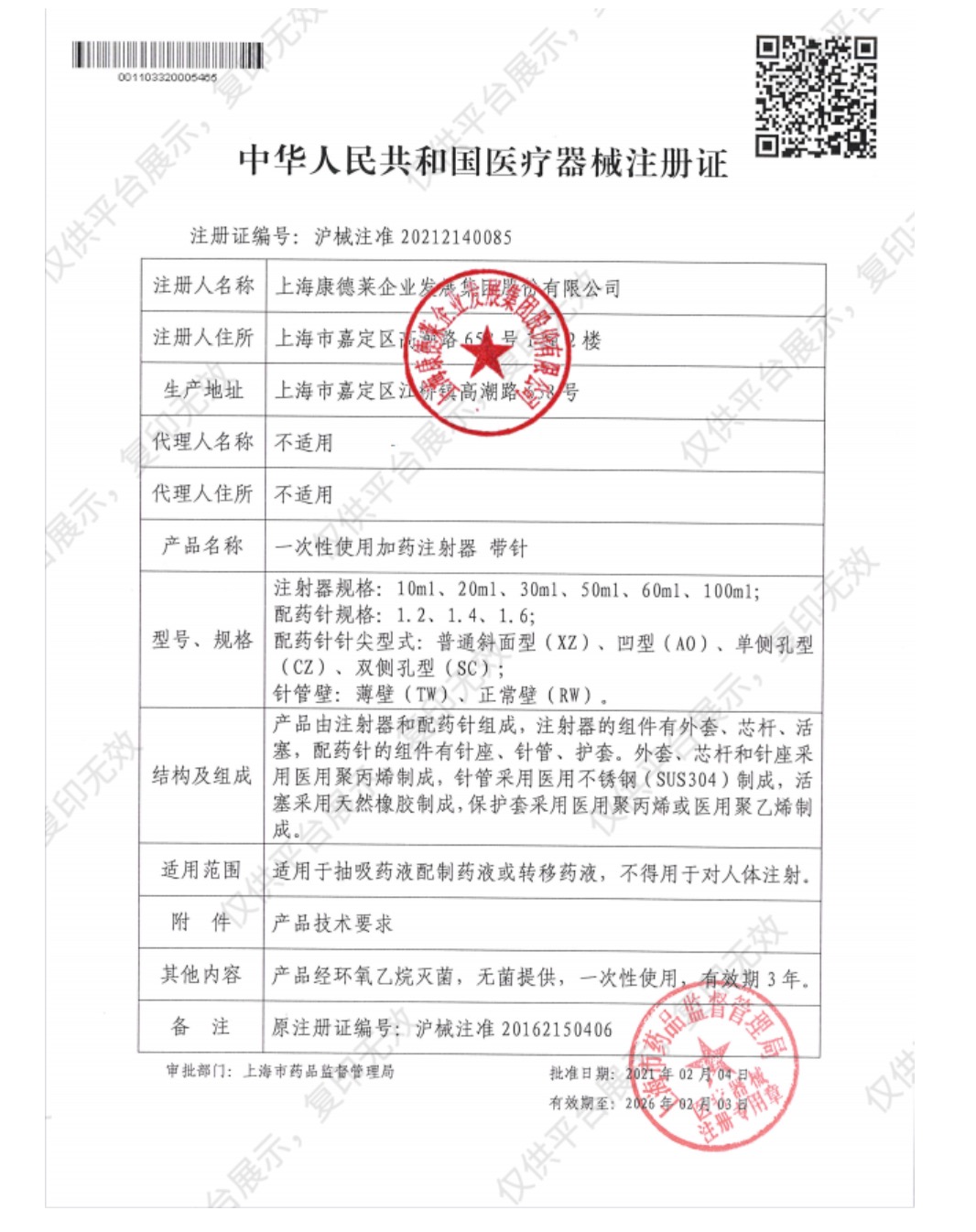 手機掃碼:康德萊一次性使用加藥注射器 30ml