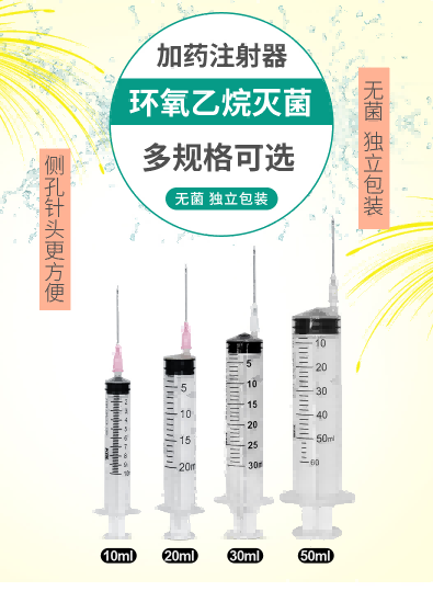 一次性使用加藥注射器有注射器和配藥注射針組成,注射器的組件有外套,芯桿,活塞,配藥注射針的組合有針座、針管、護套。環(huán)氧乙烷滅菌,產品無菌、無熱源。