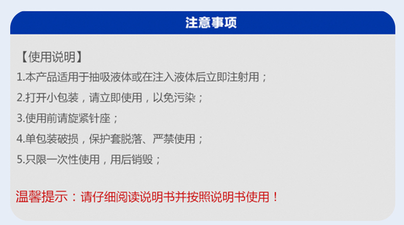 • 產(chǎn)品適用范圍:本產(chǎn)品適用于抽吸液體或在注入液體后立即注射用。