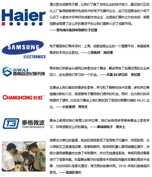 采購額:20億,現場邀請來自于海爾集團,長虹集團,錦江電子,中航凱天,思泰航空等企業現場與采購元器件和儀器儀表等產品企業達成初步合作訂單,據悉已有幾十家參展企業已經進入相關對口企業的供應商目錄中,參與采購洽談廠商八十余家。